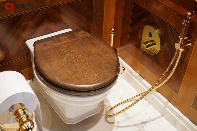 В туалете также много золотых элементов – на унитазе, на кнопках для слива воды, на шланге для биде.
