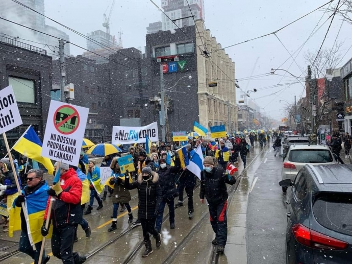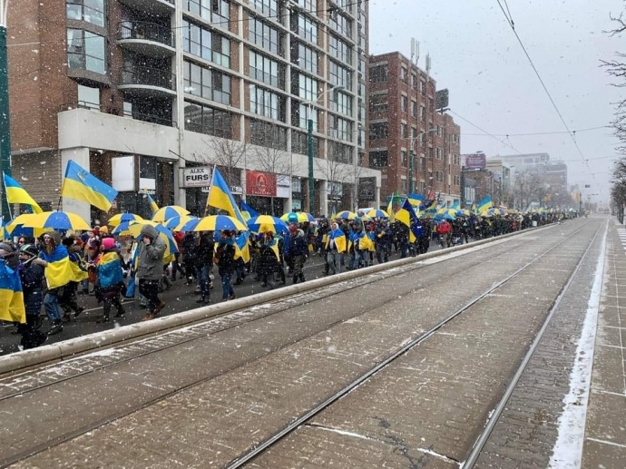 Участники шествия держали украинские флаги и плакаты со словами поддержки украинцев и требованиями правительства Канады усилить санкции против России и закрыть небо над Украиной.