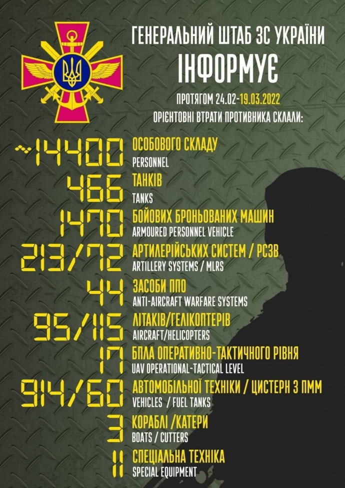 Общие боевые потери противника с 24 февраля по 19 марта ориентировочно составили: