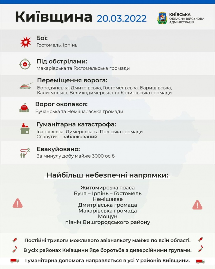 19 марта успешно завершилась эвакуация в Броварском районе, где было спасено более 2300 человек из оккупированной Богдановки и Заворычей.