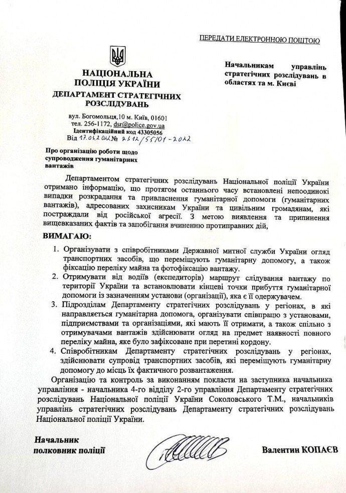 Детали: В письме говорится, что в последнее время установлены нередкие случаи хищения и присвоения гуманитарной помощи, адресованной украинским военным и гражданским лицам, пострадавшим от агрессии РФ.