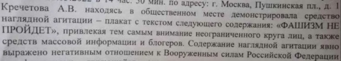 Московский суд оштрафовал Анну Кречетову на 50 тысяч рублей из-за плаката "Фашизм не пройдет", который по мнению суда "дискредитирует вооруженные силы России".
