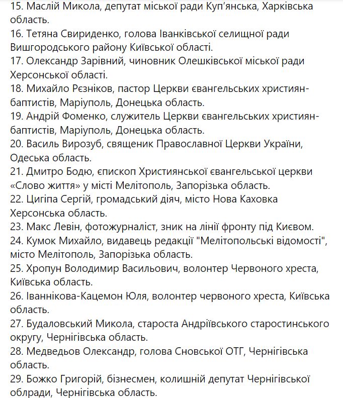 Детали: Матвийчук также разместила на своей странице публичную часть списка представителей гражданского общества, которые по состоянию на 26 марта 2022 года незаконно удерживаются Россией.