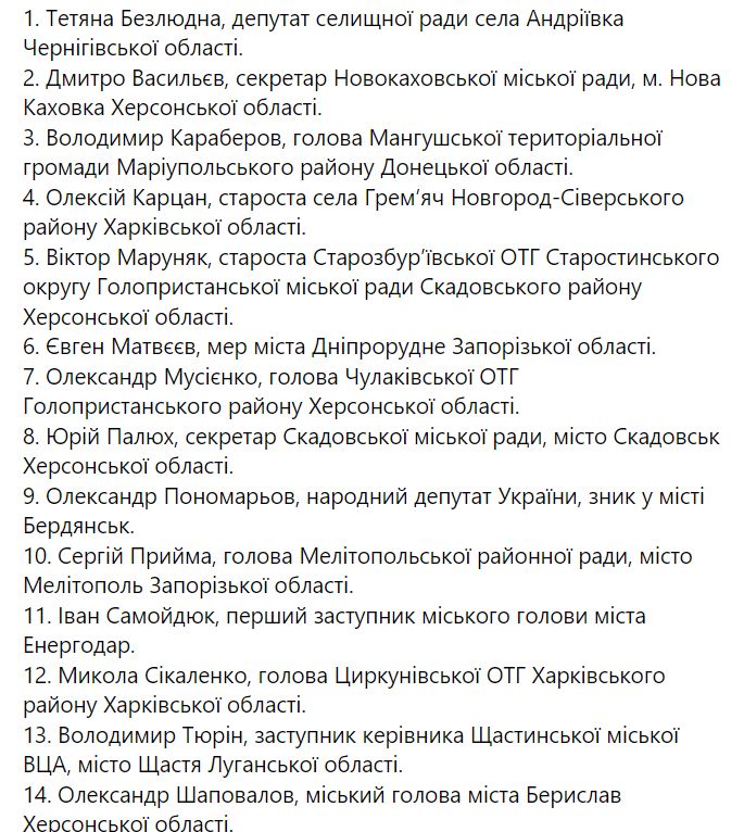 Опубликован список 36 публичных деятелей и активистов, задержанных Россией на временно оккупированных после 24 февраля территориях Украины.