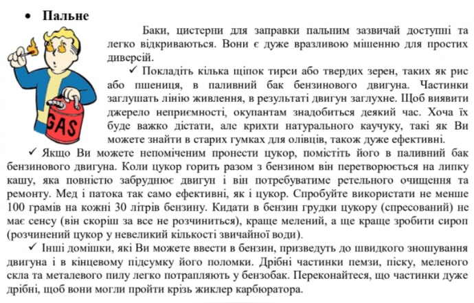 Дословно: "Вашими действиями вы можете побуждать оккупантов принимать ошибочные решения, тормозить их деятельность и мотивировать своих земляков к подражанию. Например, можно доброжелательно указывать оккупанту неверное направление дороги, холодно относиться к агрессорам и коллаборантам для снижения их морального духа, бойкотировать участие в мероприятиях под любыми предлогами, делать анонимные звонки и оставлять записки с угрозами в почтовых ящиках, что позволяет достичь морального давления на врага и снизить эффективность его действий.
