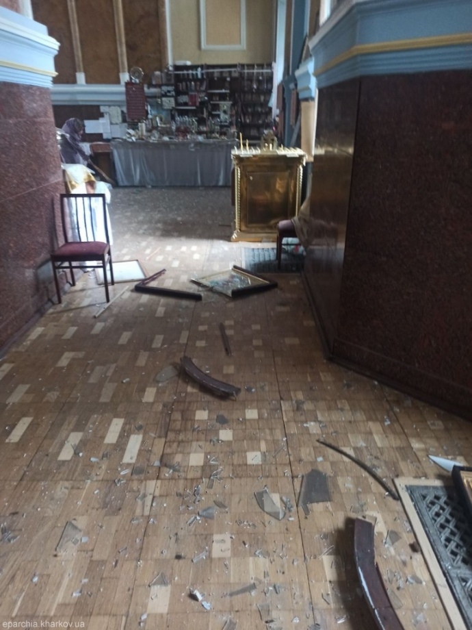 Дословно: "2 марта 2022 года в результате обстрелов поврежден собор в честь Успения Пресвятой Богородицы города Харькова".