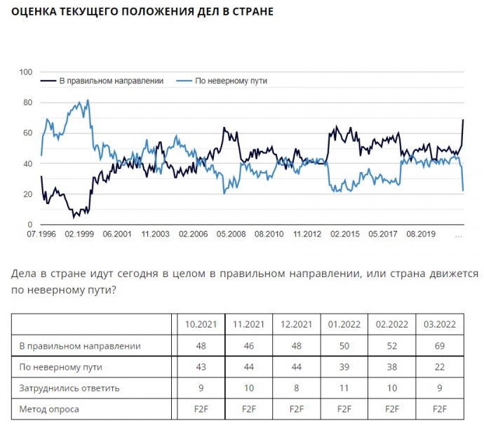 Также социологи зафиксировали существенный рост числа россиян, убежденных, что положение дел в России движется в правильном направлении. В марте 69% россиян были убеждены, что их страна идет в правильном направлении, тогда как в феврале таковых было 52%.