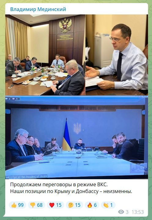 - Глава российской делегации Владимир Мединский считает, что Украина в Стамбуле заявила о готовности выполнить "принципиальные требования" РФ, при этом он ничего не сказал об отводе войск и дал понять, что Кремль не пойдет на компромиссы по Крыму и Донбассу.