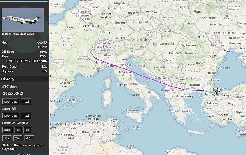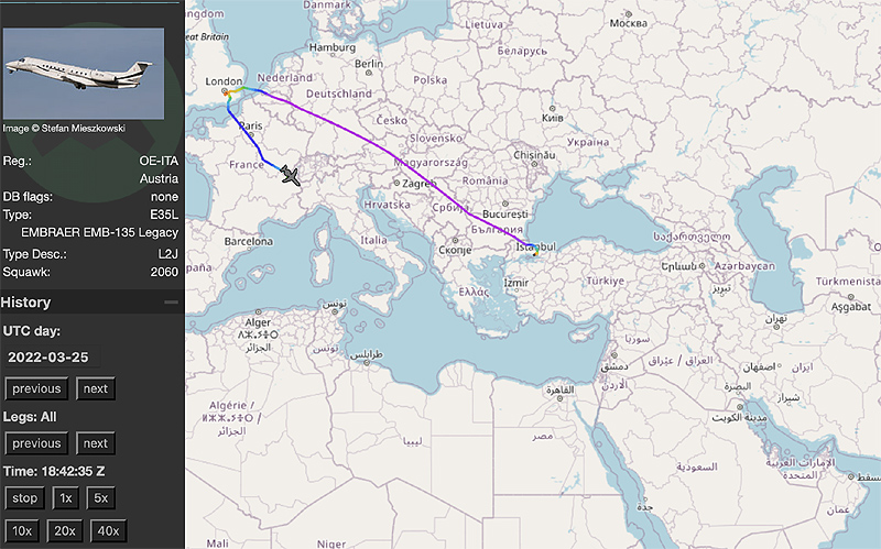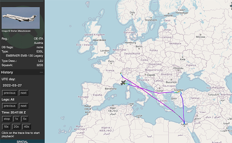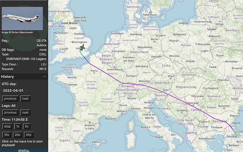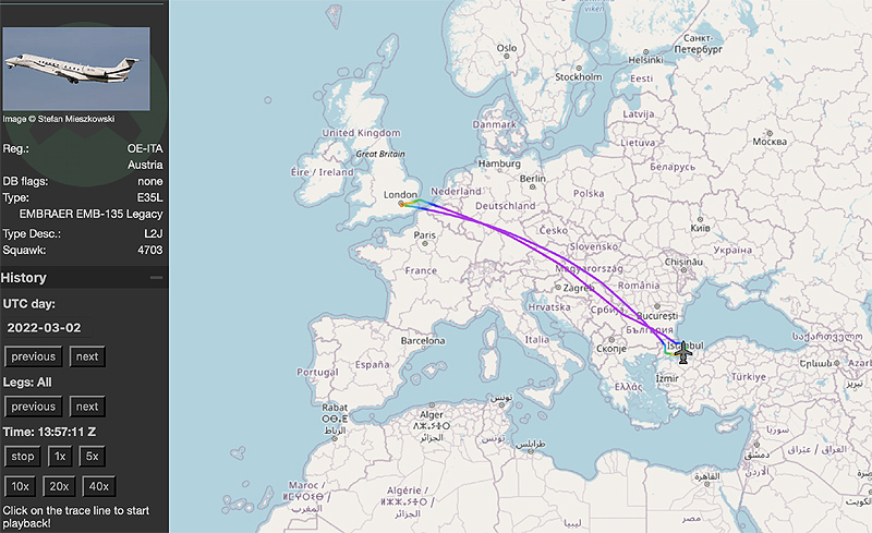 С 24 февраля самолет четыре раза успел побывать в Лондоне, четыре раза посетил Женеву, один раз был в Ницце, дважды в Каире, один раз в Дубае и 5 раз останавливался в Стамбуле.