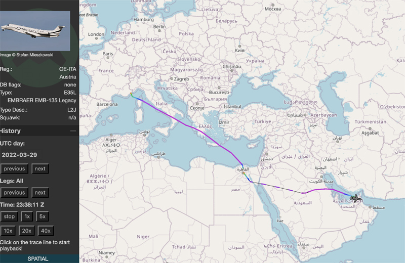 29 марта самолет вылетел из Ниццы в столицу Египта Каир и в тот же день улетел в Дубай.