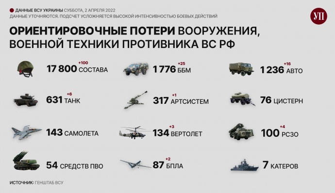 Детали: Общие боевые потери противника с 24.02 по 02.04 ориентировочно составили:
