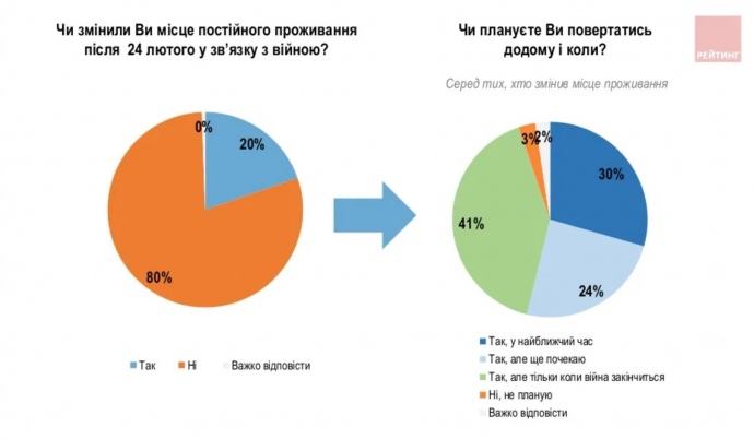 Сменили место жительства с началом войны 20% взрослого населения Украины, треть из них планирует возвращаться домой уже в ближайшее время.