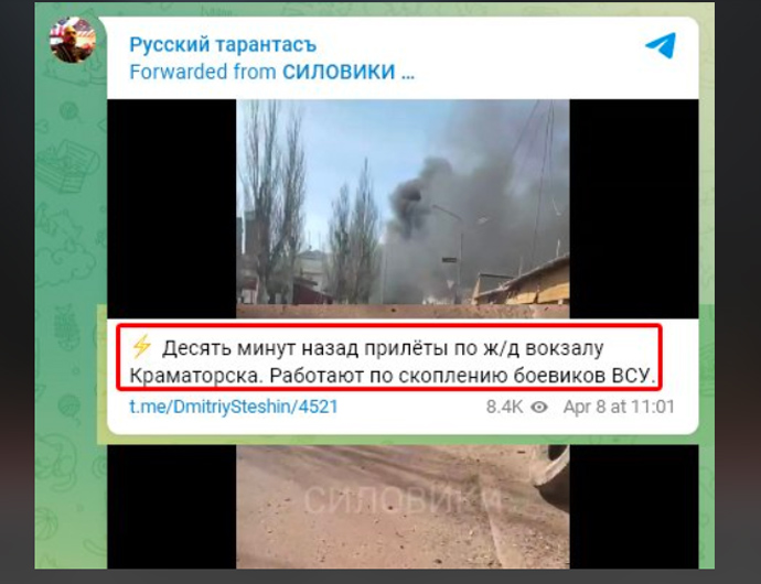 За 20 мин до появления сообщений о ракетном ударе по железнодорожному вокзалу города Краматорск, в телеграмм-канале "Типический Донецк" появилось видео запуска двух ракет из оккупированного Шахтерска, а российские пропагандисты быстро написали об ударе по позициям ВСУ, а затем так же быстро все это удалили.
