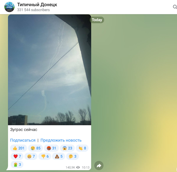 Детали: Сначала в 10:13 в телеграмм-канале появилось фото из Зугреса (недалеко от Шахтерска). На нем было два инверсионных следа в небе.
