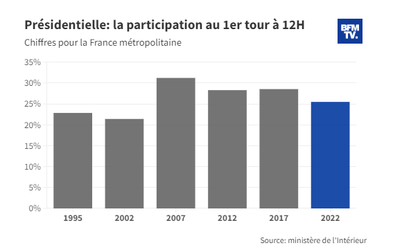 По состоянию на 12 часов дня, на континентальной части Франции участие в первом туре президентских выборов приняло около 25% избирателей - несколько меньше, чем в 2017 году.
