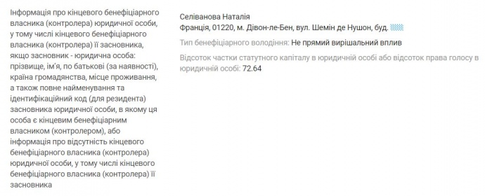 В то же время, по данным Youcontrol, конечным бенефициаром является Селиванова Наталья с регистрацией во Франции.