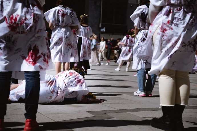 Одетые в самодельные белые платья со следами "крови" на них девушки синхронно легли посреди площади, символизируя жертв сексуального насилия, совершенного российскими воинами в Украине. За акцией наблюдали около тысячи прохожих.