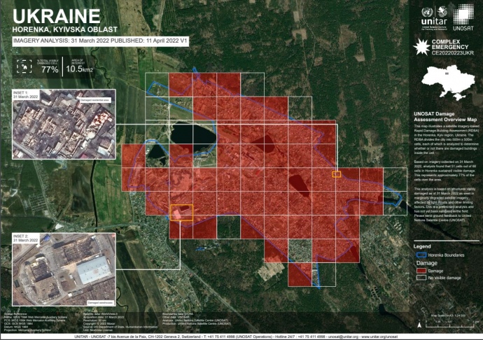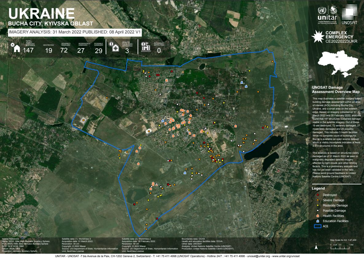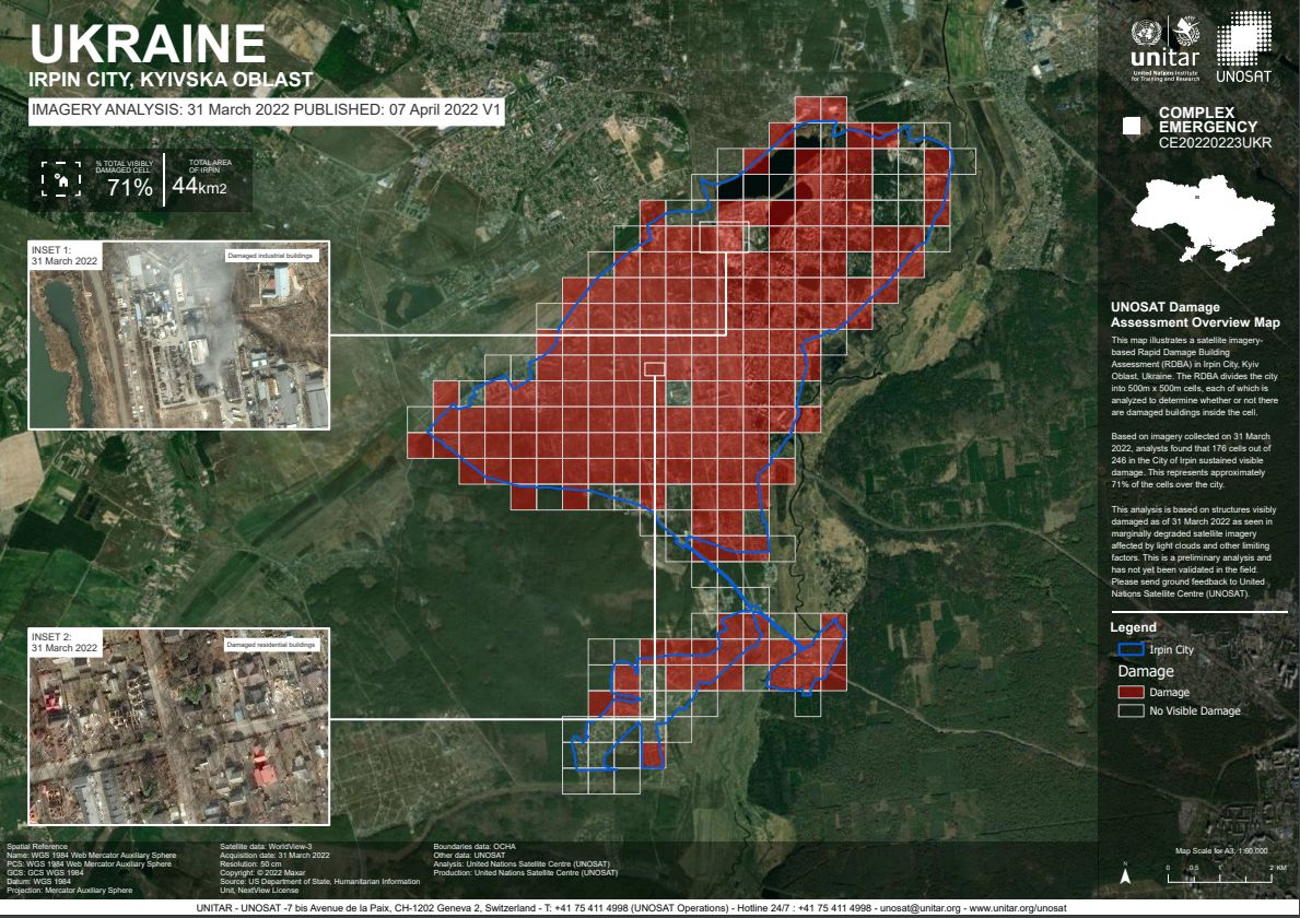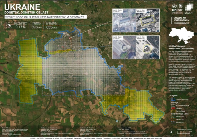 Спутниковый центр ООН UNOSAT показывает уровень разрушений украинских городов во время войны по снимкам из космоса, это предварительные данные.