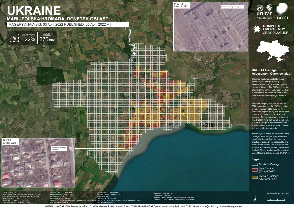 В Мариуполе по состоянию на 3 апреля разрушения оценивались в 22%, согласно спутниковым снимкам. Власти города еще в марте оценивали разрушение в 80-90%.