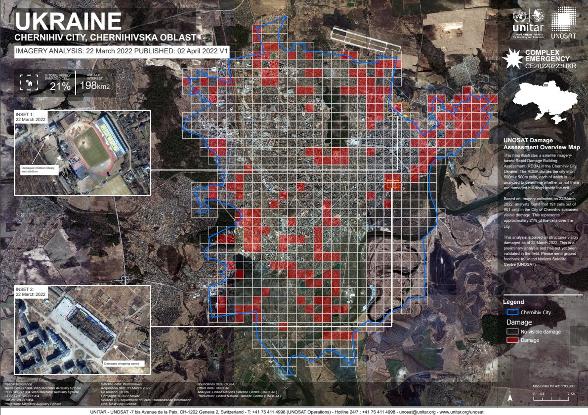 В Чернигове, по оценке из космоса, потерпели разрушения 21% объектов. Городской глава Чернигова Владислав Атрошенко после отступления россиян из города оценивал разрушения в 70%.