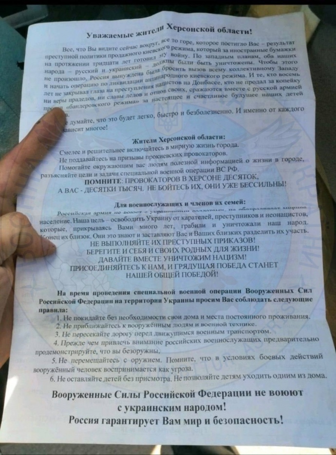 В оккупированном Херсоне россияне раздают листовки, в которых излагают свою пропагандистскую версию причин войны и призывают местных жителей вести разъяснительную работу в пользу РФ.