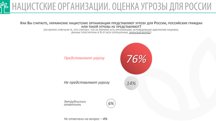 Детали: 76% опрошенных считают, что якобы украинские нацистские организации представляют угрозу для России и российских граждан, 14% придерживаются противоположной позиции, 6% затруднились с ответом, 4% не отвечали на этот вопрос.