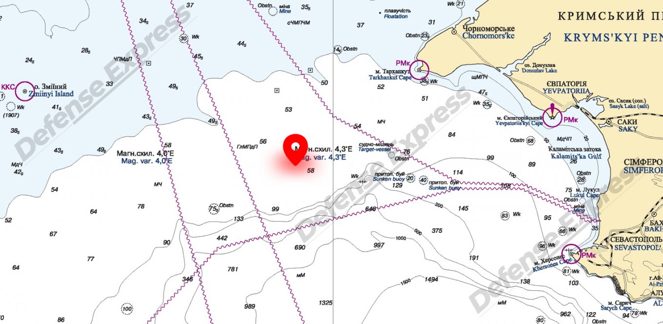 Детали: Остатки флагмана ЧФ РФ находятся в ориентировочных координатах 44°56' N 31°44' E, на глубине 50-60 метров. Этот район вычислен Defense Express с опорой на дополнительную информацию, полученную из собственных источников.