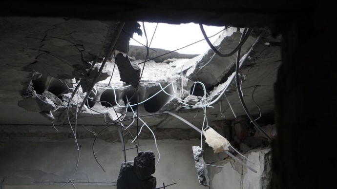 Один из снарядов пробил крышу и перекрытие пятиэтажки, разрушены стены не менее четырех квартир, раненых нет.