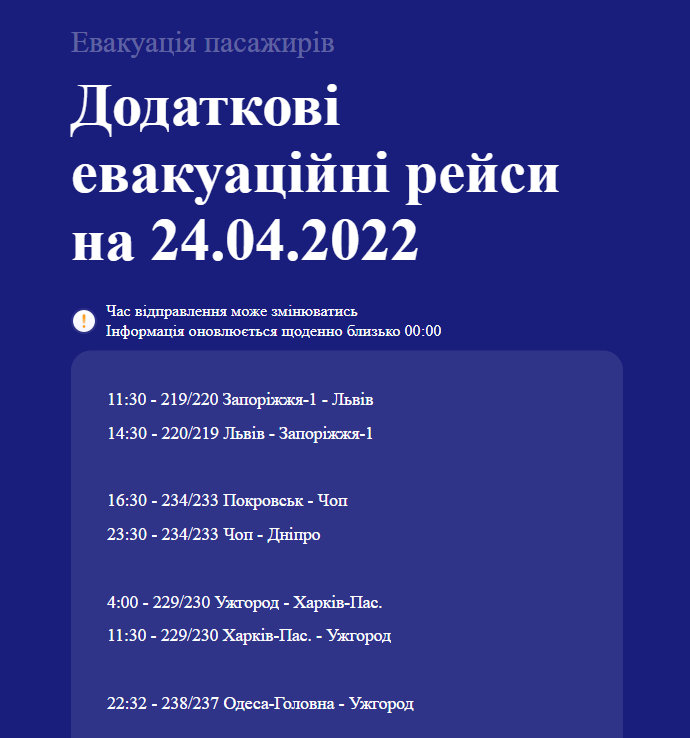 "Укрзализныця" обнародовала расписание дополнительных эвакуационных рейсов на 24 апреля.