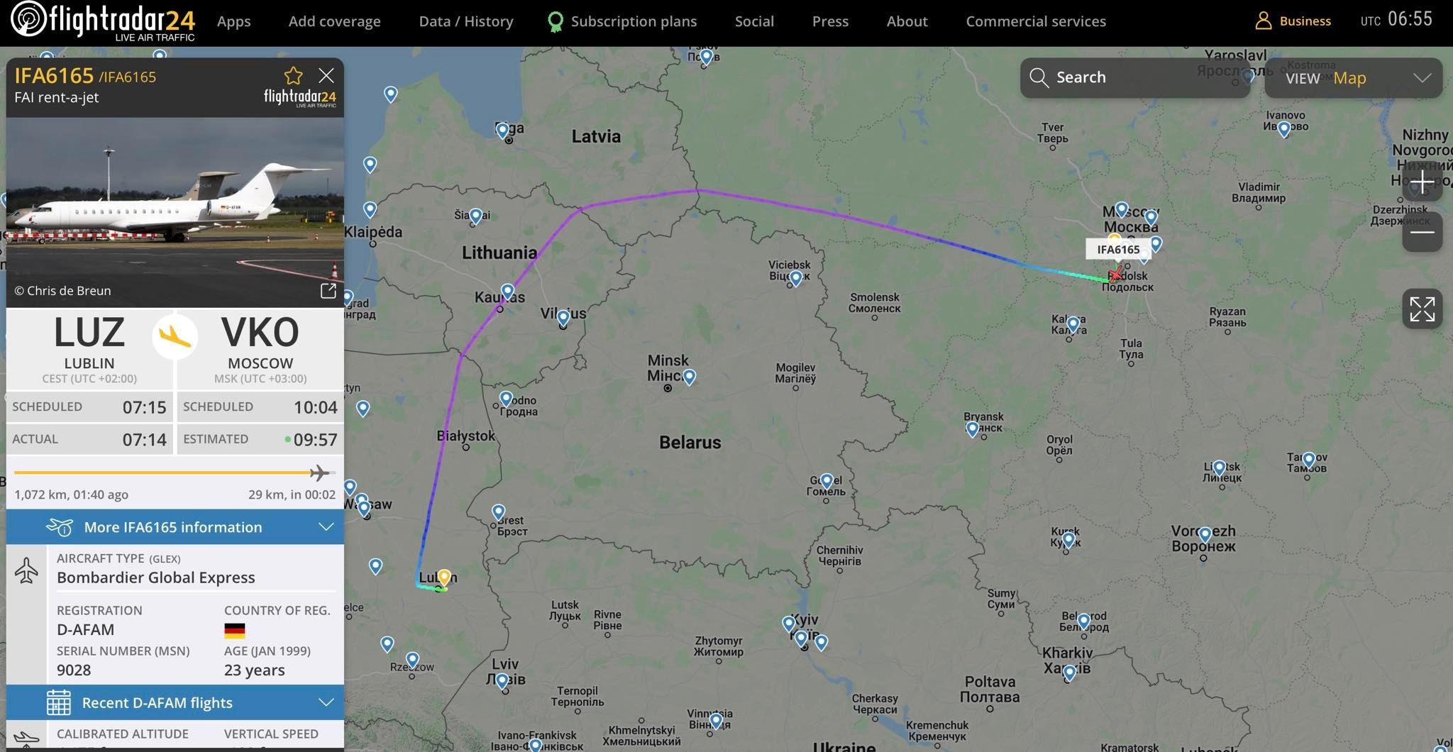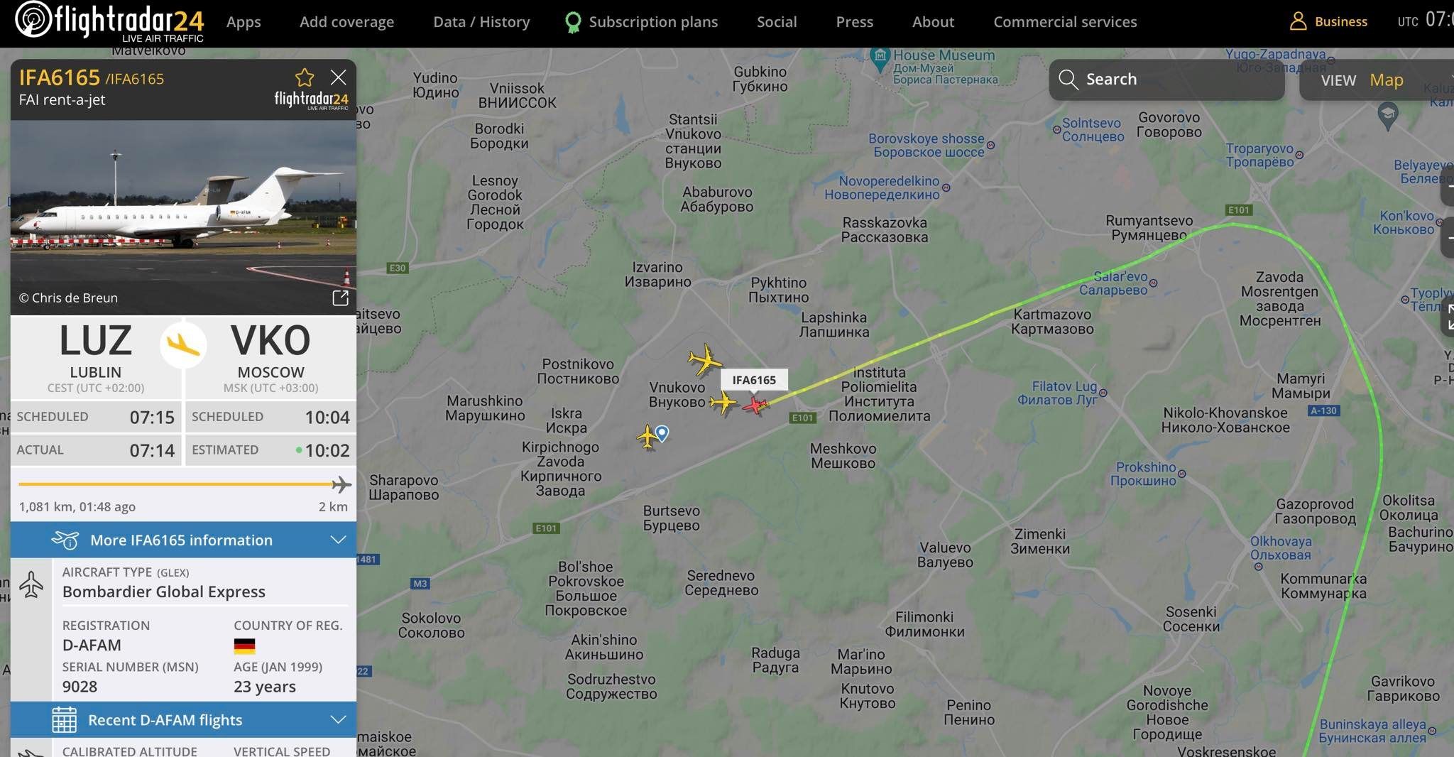 Самолет вылетел из Польши, но имеет немецкую регистрацию.