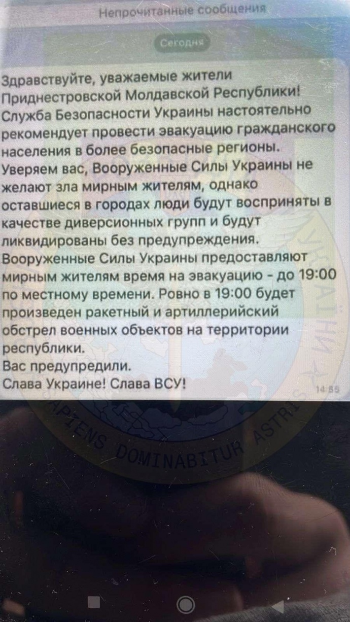 Украинская разведка предупреждает об очередной провокации российских спецслужб на территории непризнанного Приднестровья. Местные жители получают СМС от якобы ВСУ, в которых содержится предупреждение о ракетном ударе.