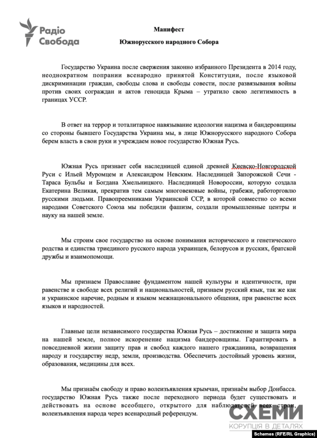 Детали: В перехваченном документе под названием "Манифест Южнорусского народного Собора", которым располагают "Схемы", речь идет о планах "основания нового государства" в ответ якобы на "террор и тоталитарное навязывание идеологии нацизма и бандеровщины".