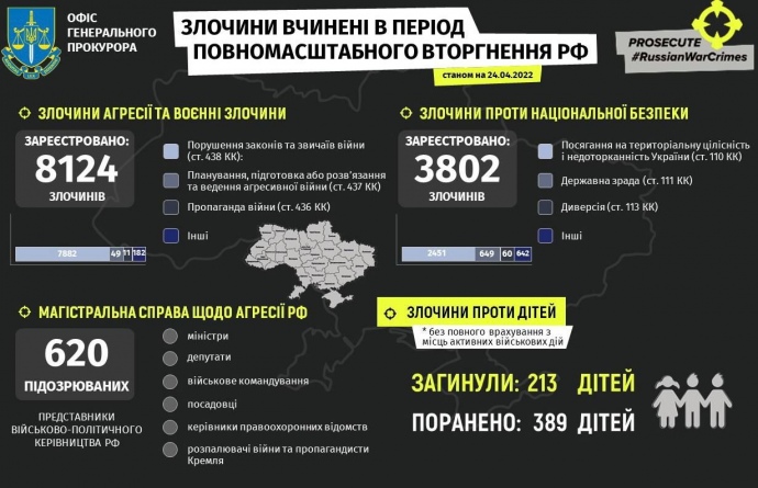 По состоянию на 3 мая более 626 детей пострадали в Украине в результате вооруженной агрессии Российской Федерации: по официальным и неполным данным 220 детей погибли и более 406 получили ранения.