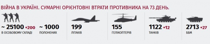 С 24 февраля Россия в войне против Украины потеряла, среди прочего, около 25 тысяч солдат, более 1,1 тысячи танков, полтысячи артиллерийских систем и две сотни военных самолетов.