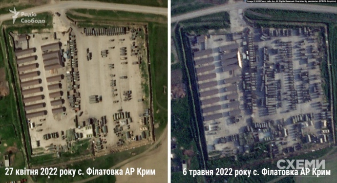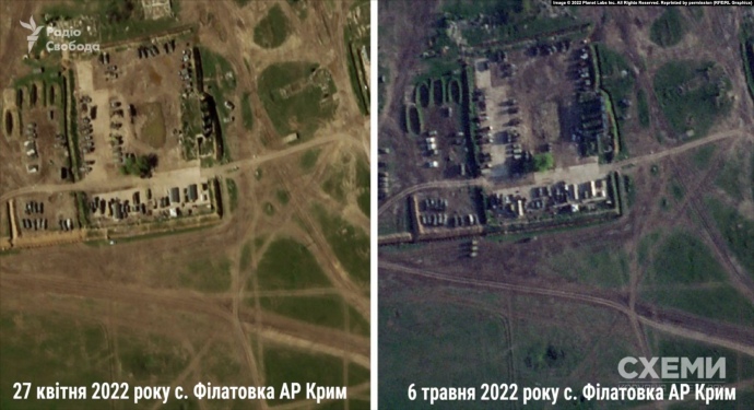Детали: Российские военные разместили технику в селе Филатовка на двух участках населенного пункта. В мае на одном из этих участков количество военной техники увеличилось, свидетельствует спутниковый снимок Planet Labs за 6 мая, которым располагают "Схемы".