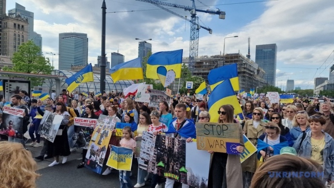 Тысячи людей вышли в центр Варшавы на акцию протеста "Россия, иди на х.", во время которой потребовали спасти защитников Мариуполя и высмеяли армию оккупантов.
