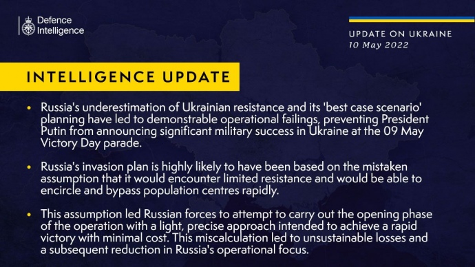 "Недооценка Россией украинского сопротивления и планирования по "лучшему сценарию" привели к очевидным оперативным неудачам, не дав президенту Путину объявить о значительном военном успехе в Украине на параде в День победы 9 мая", – говорится в обзоре.