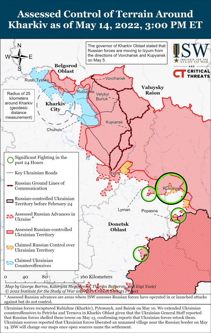 Армия РФ продолжает отходить с севера Харьковской области, но предположительно будет стремиться удержать линию для защиты своих наземных коммуникаций от Белгорода через Волчанск до Изюма. В то же время, в Украине заговорили о контрнаступлении в районе Изюма.