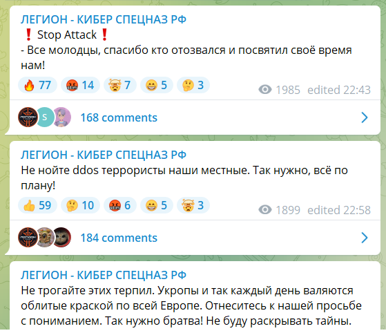 Впрочем, в телеграмм-канале, координирующем группу "Легион", вечером в субботу, еще до начала голосования, действительно осуществлялась координация DDOS-атаки на сервере песенного конкурса Евровидения. Однако эта атака длилась всего 13 минут, после чего координаторы дали указание прекратить атаку без объяснений.