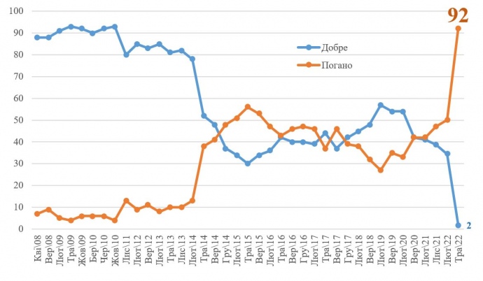 С начала полномасштабного вторжения России в Украину резко ухудшилось отношение украинцев к стране-агрессору – сейчас 92% опрошенных относятся в РФ плохо и только 2% – хорошо.