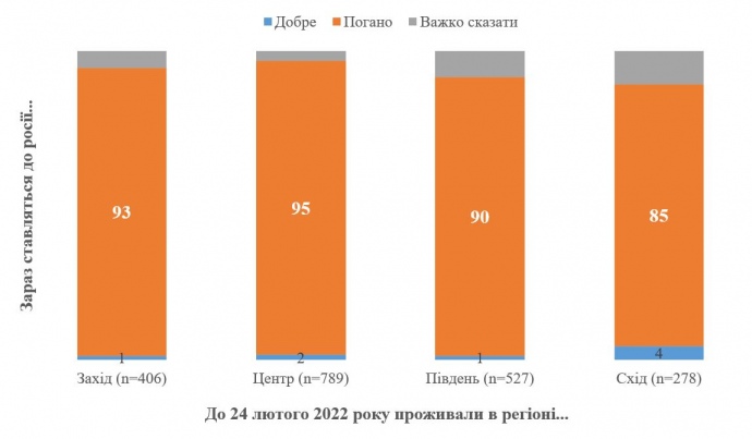 По данным социологов, во всех регионах Украины абсолютное большинство жителей плохо относятся к России, в частности, на Юге 90% плохо относятся, на Востоке – 85% (в то время как в начале февраля соответственно 45% и 53% хорошо относились к России).
