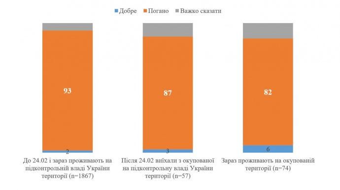 Абсолютное большинство граждан – 82% – продолжающих проживать на оккупированной после 24 февраля территории, негативно относятся к России, и только 6% положительно относятся к ней.