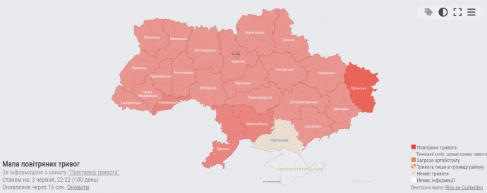 Детали: По состоянию на 22:40 воздушная тревога объявлена во всех областях, кроме Херсонской области, большая часть которой оккупирована российскими войсками, и оккупированного Крыма.