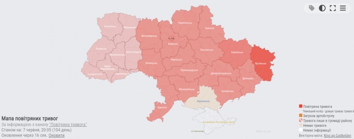 Детали: По состоянию на 20:15, воздушная тревога объявлена по всей Украине, кроме оккупированного Крыма и Херсонской области.