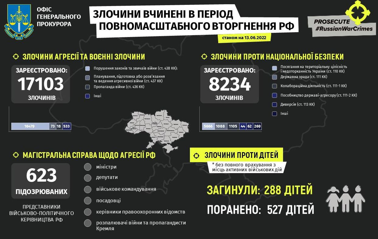 По состоянию на утро 13 июня по меньшей мере 815 детей пострадали в Украине в результате полномасштабной вооруженной агрессии Российской Федерации: 288 детей погибли и 527 детей ранены.