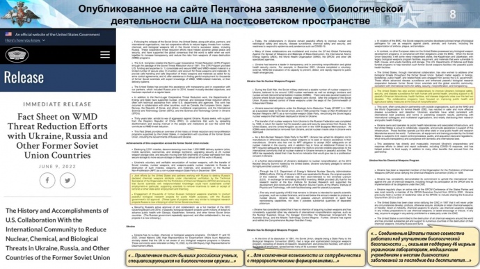 Детали: Оккупанты сообщают, что "на сайте Пентагона опубликовали официальное заявление о биологической деятельности США на территории постсоветского пространства".
