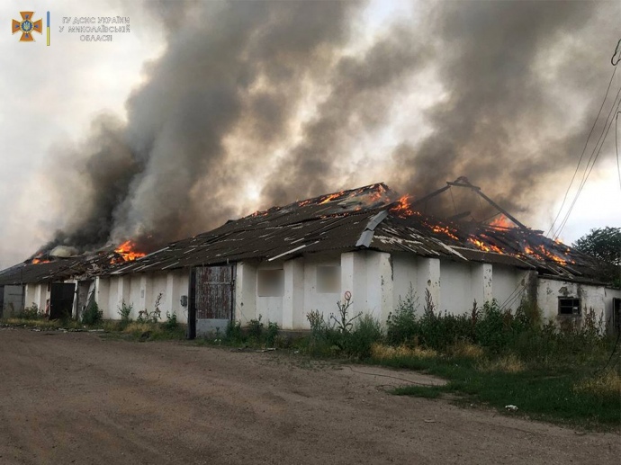 В результате вражеских обстрелов горело зернохранилище на территории Первомайской ТГ Николаевского района. Пожарные пожар площадью 8 000 кв. м ликвидировали".