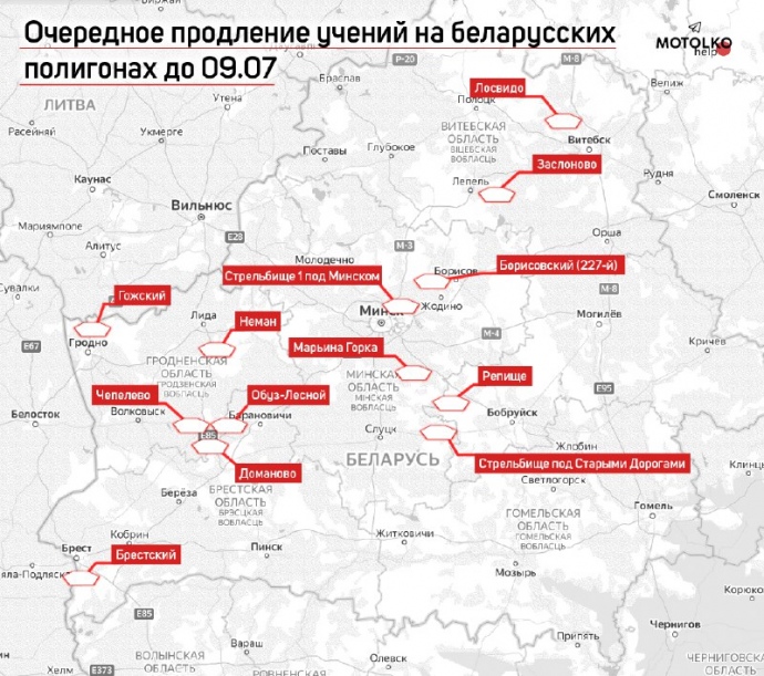 - Беларусь уже неоднократно продлевала свои военные учения. Сначала их продлили до конца мая. 3 июня стало известно, что Вооруженные силы Беларуси продолжили учения как минимум до 11 июня, а позже сообщалось уже о 25 июня.