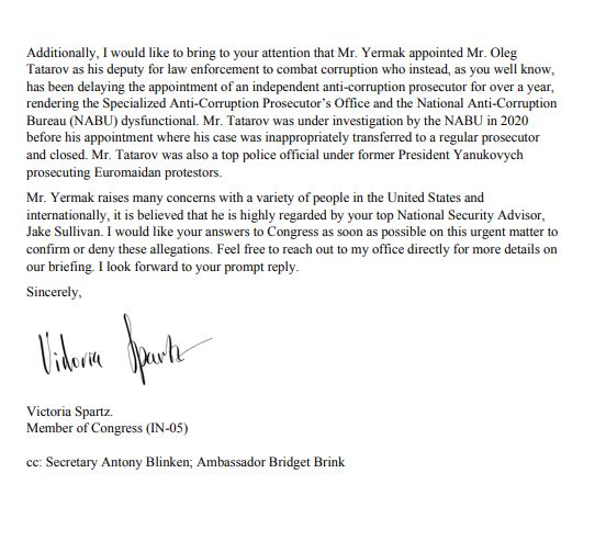 Конгрессвумен также упоминает в письме, что глава Офиса президента назначил своим заместителем по вопросам правоохранительной деятельности Олега Татарова, в то время как он "задерживает назначение независимого антикоррупционного прокурора более года, из-за чего Специализированная антикоррупционная прокуратура и Национальное антикоррупционное бюро не функционируют".
