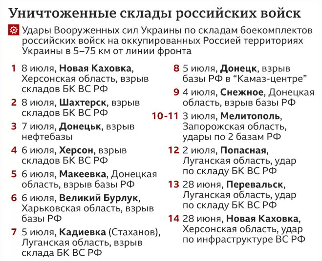 После 10 июля сообщалось о мощных взрывах складов с боеприпасами в оккупированных Алчевске и Шахтерске. Также сообщалось об уничтожении складов в Херсонской области.